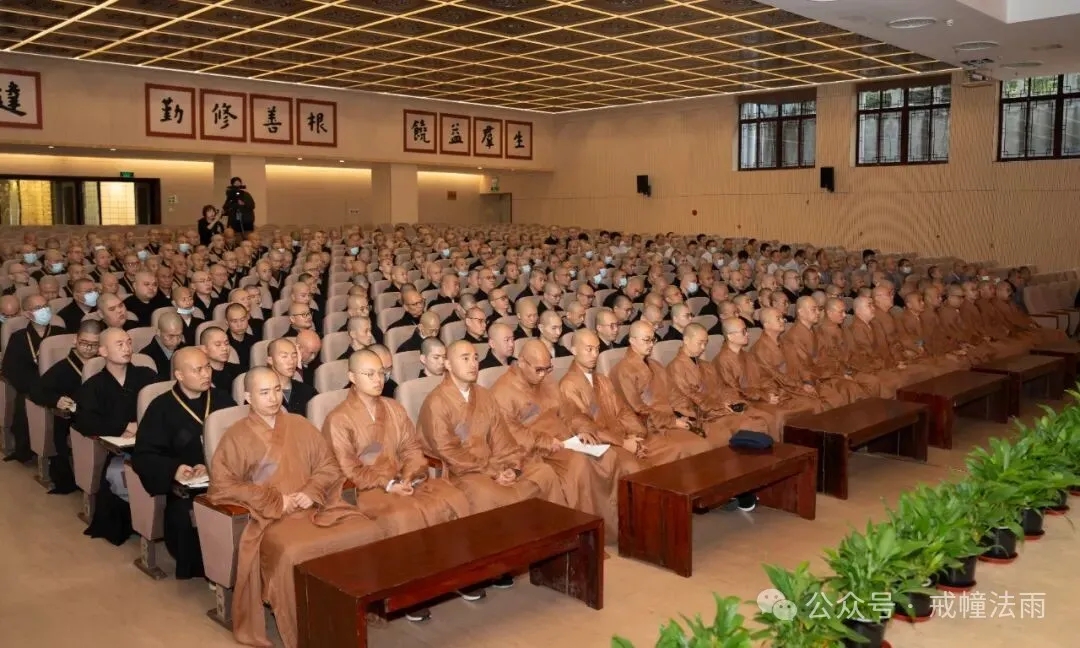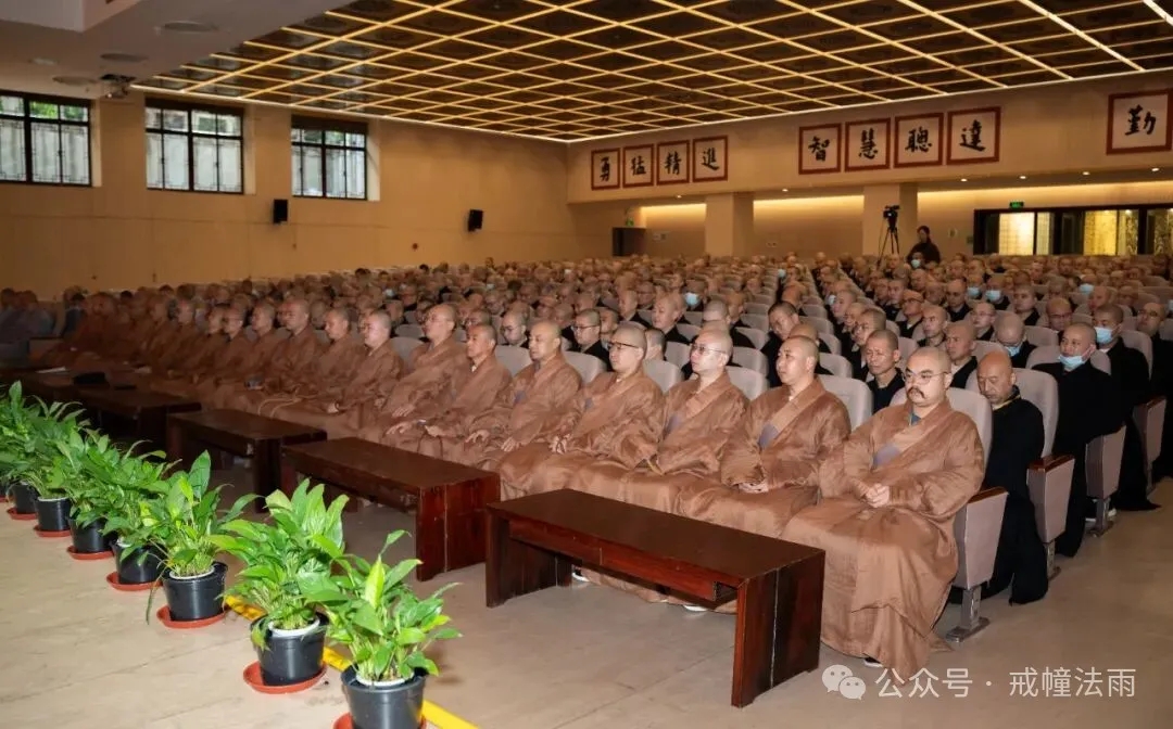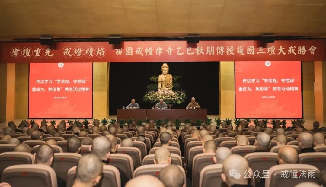 2025年11月2日,苏州西园戒幢律寺组织全体僧众、研究所师生、教职员工及全体戒子,开展专题学习会议,深入学习党的二十届四中全会精神、习近平总书记在二十届中央政治局第二十二次集体学习时的重要讲话精神和全国性宗教团体联席会议第三十二次会议等精神。同时,会议上还重点围绕江苏省佛教协会制定的“学法规、守戒律、重修为、树形象”教育活动实施方案进行传达部署。