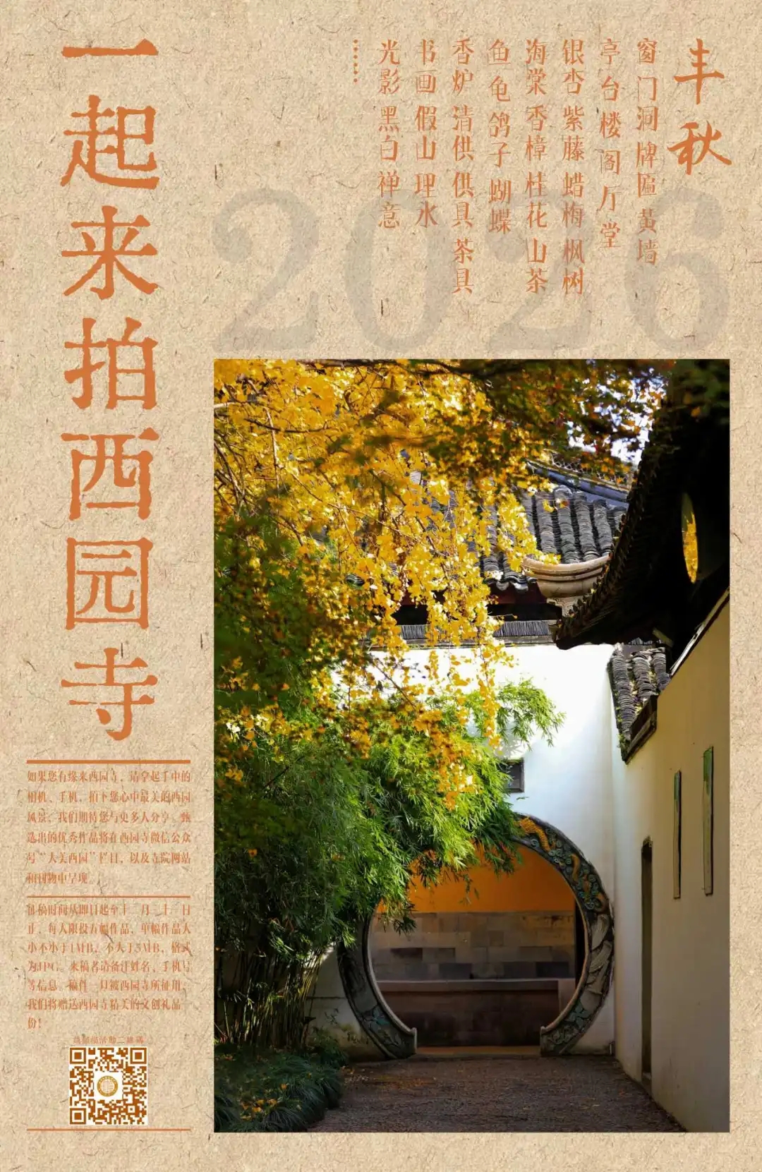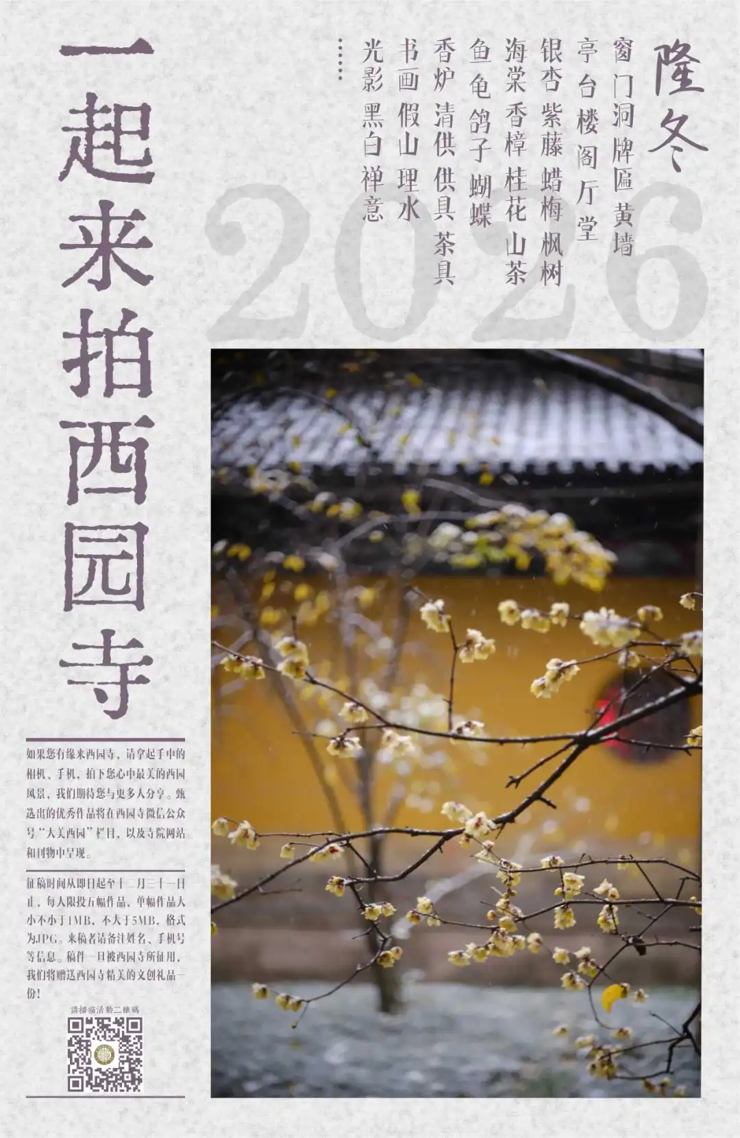 如果您有缘来西园寺,请拿起手中的相机、手机,拍下您心中最美的西园风景,我们期待您与更多人分享。甄选出的优秀作品将在西园寺公众号“大美西园”栏目,以及寺院网站和刊物中呈现。