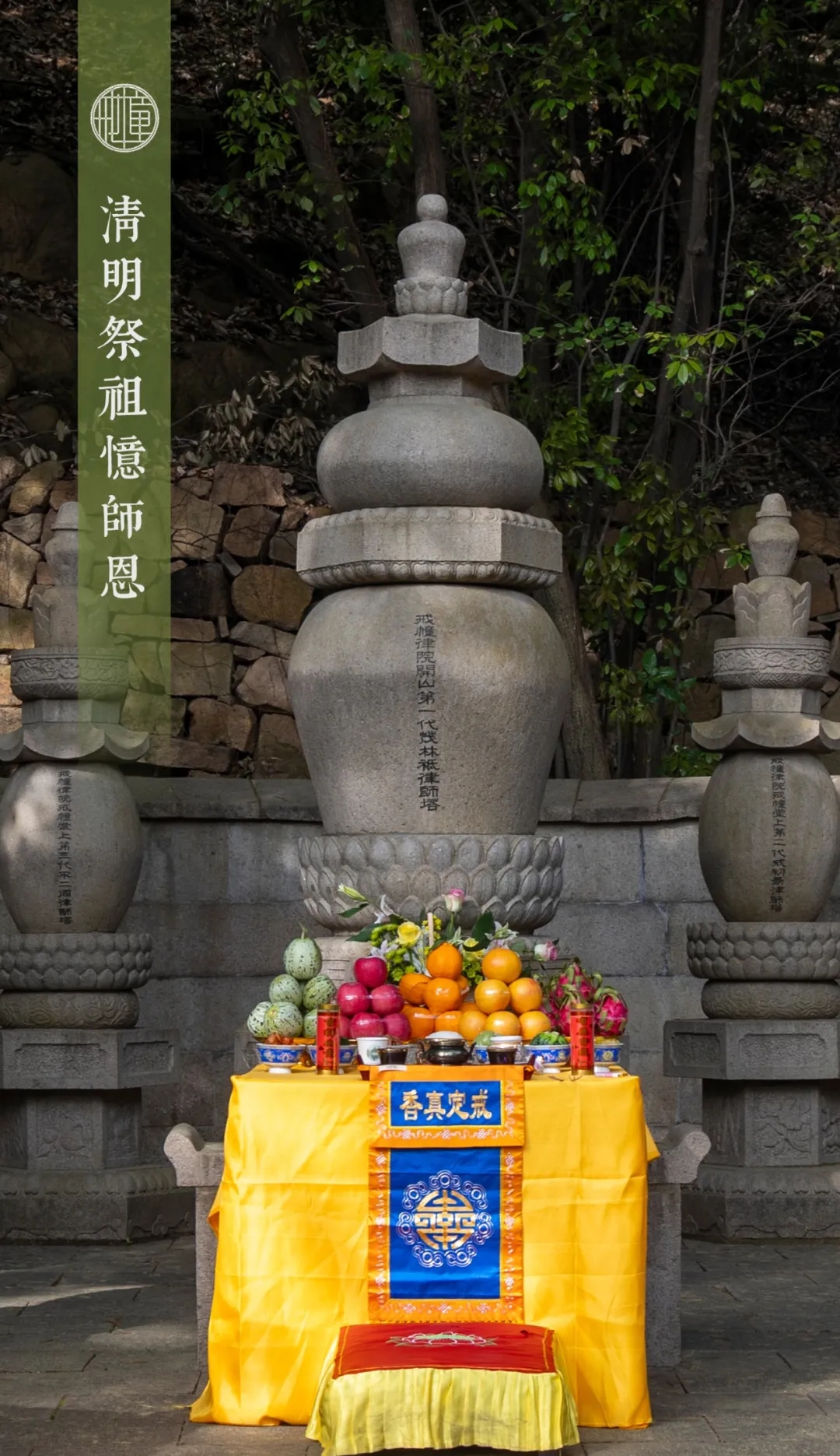 西园寺祖师塔林矗立在山间的一片苍翠草木间,承载着寺院千百年的历史脉络,见证了戒幢律宗的代代传承。祖师塔林前,香、花、果供奉先祖,普仁大和尚带领僧众依次前往各祖师塔前礼拜,现场如律如仪,清净庄严。春山不语,同沐佛恩;梵音绕林,和鸣哀雅。